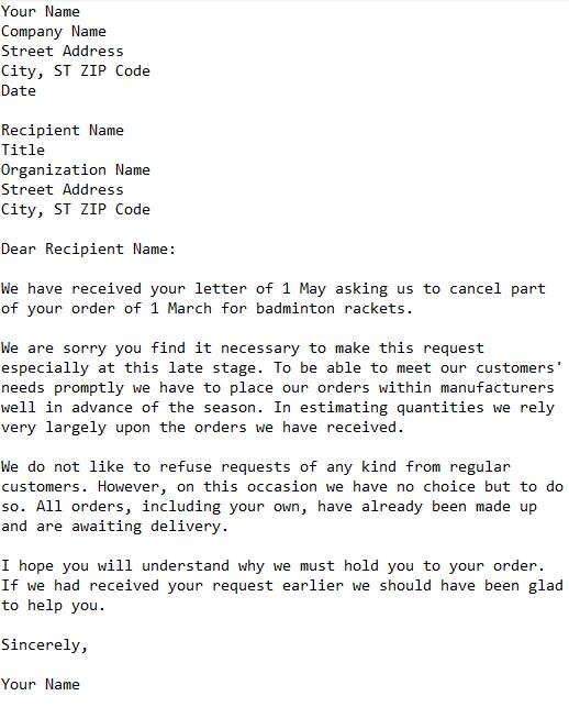 Want to learn more similar topic about reply letter from supplier refuses to cancel order? Below are related examples:
